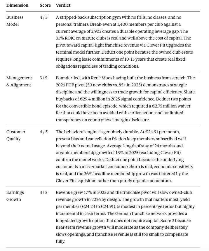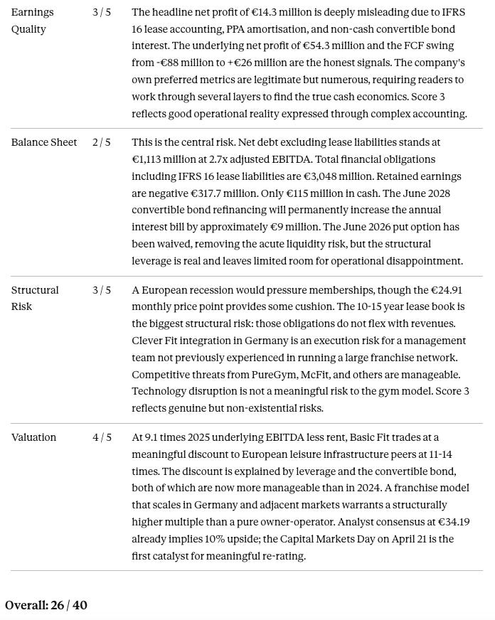 A solid infrastructure business in a deliberate strategic pivot, priced at a discount that reflects yesterday’s risks more than today’s trajectory. The scorecard would improve toward 30+ if the 2028 bond refinancing is executed cleanly, franchise revenue from Clever Fit becomes a visible earnings contributor, and yield per member sustains its upward trend past €26. It would deteriorate toward 20 if European consumer spending weakens materially, leverage limits the company’s ability to respond, or the Clever Fit integration disappoints.