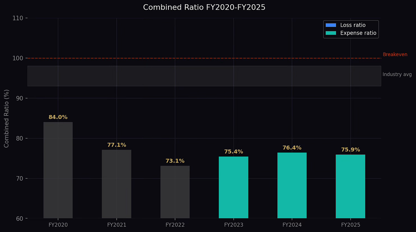 Chart 3: Combined ratio trend FY2020-FY2025. White band shows approximate industry average. Breakeven = 100%.