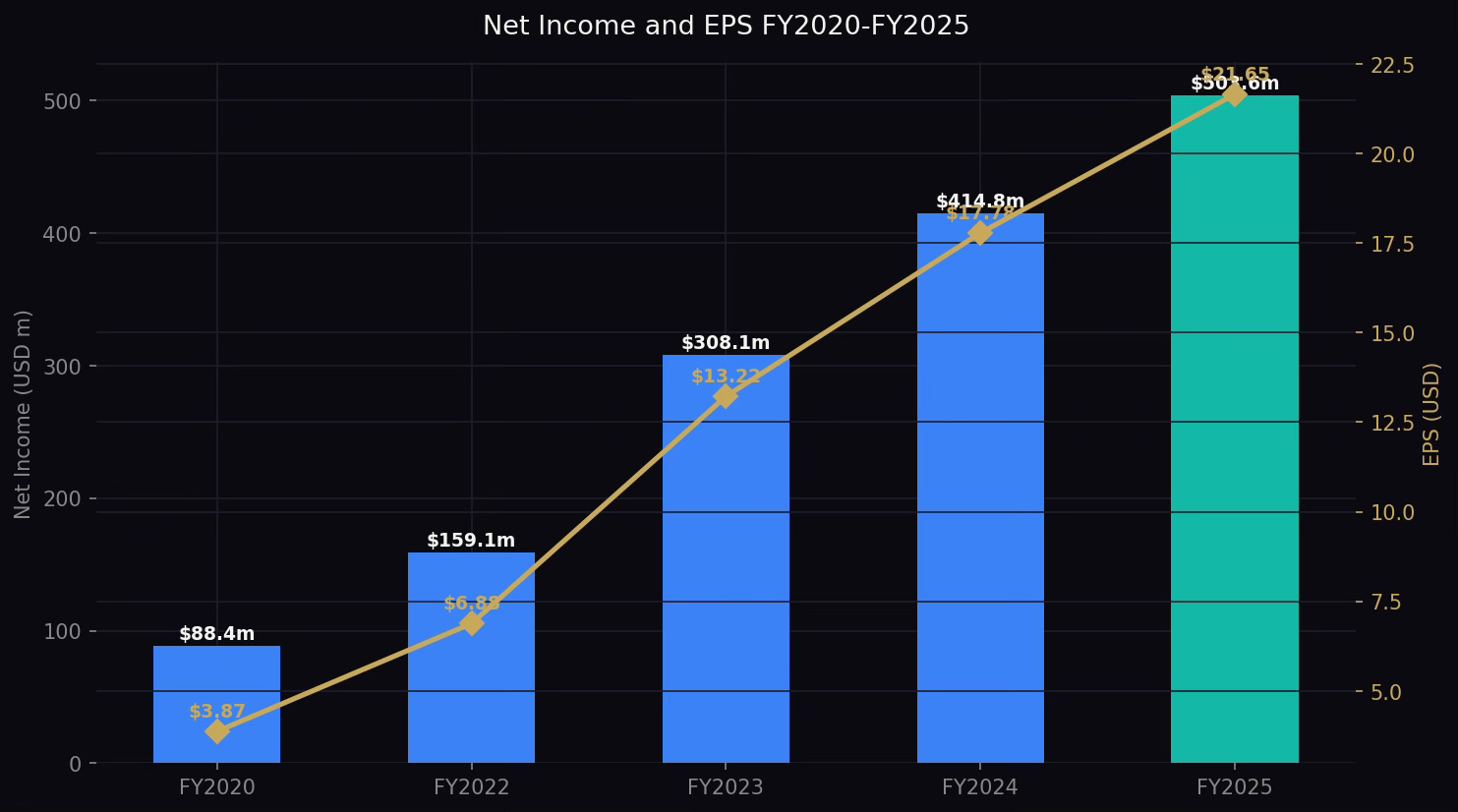 Chart 4: Net income (bars) and diluted EPS (gold line) FY2020-FY2025.