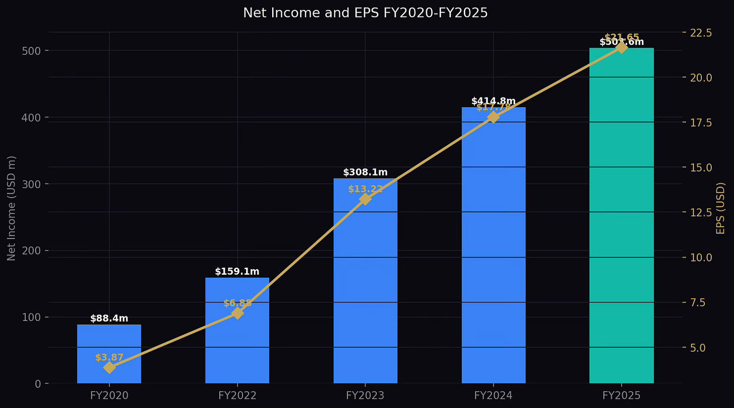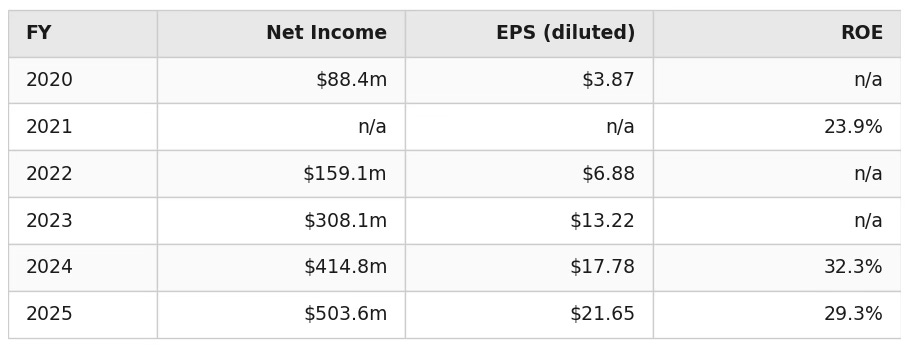 The five-year record is exceptional. FY2025 adds a new chapter: growth decelerated sharply, but the earnings quality held.