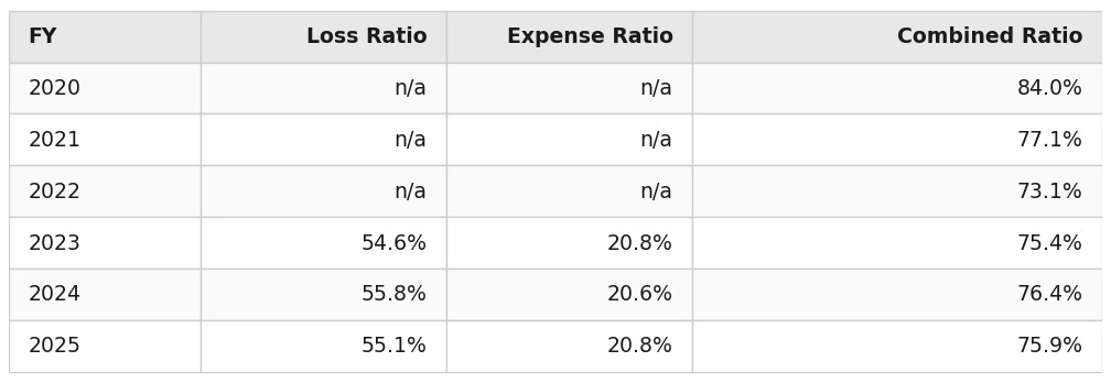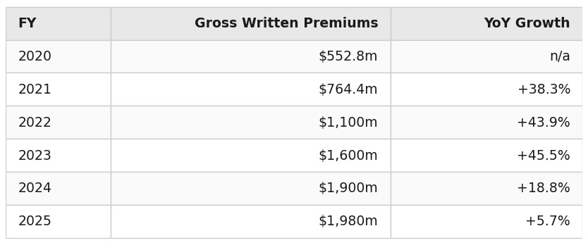 The float grows with the premium base. Even if premium growth normalises to 15-20%, the float continues to expand, generating incremental investment income. At current interest rates, $3.0 billion of float generates approximately $150 million per year. If the premium base reaches $3 billion, the float-derived income stream becomes a material component of total earnings independent of underwriting results.
