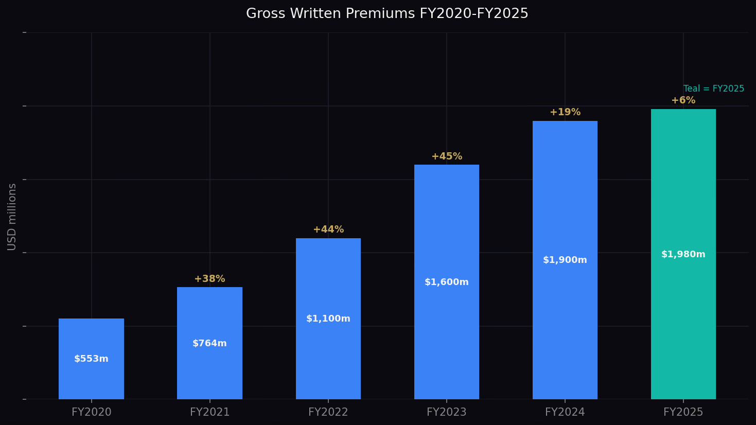 Chart 2: GWP FY2020-FY2025. Five-year CAGR approximately 29%. Teal bar = FY2025