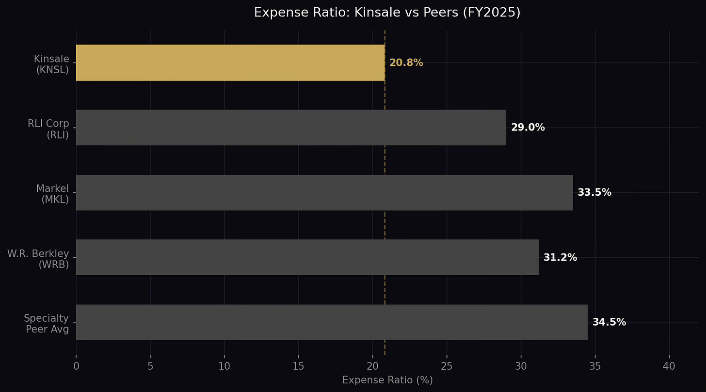 In FY2025, Kinsale’s expense ratio was 20.8%. The specialty insurance peer average sits in the mid-30s. That gap -- roughly 13-15 percentage points -- is permanent and compounding. On $1.6 billion of net written premiums in FY2025, it represents approximately $200 million of additional underwriting profit per year relative to a peer operating at average efficiency.
