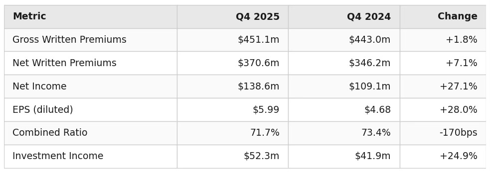 Q4 2025 was Kinsale’s strongest quarter of the year: combined ratio of 71.7%, net income +27.1%, EPS $5.99. The full-year FY2025 picture is one of growth deceleration (+5.7% GWP) offset by exceptional underwriting quality (combined ratio 75.9%) and a fast-compounding investment income stream ($192.2m). Q1 2026 results are due April 23, 2026.
